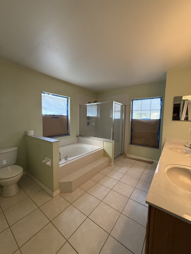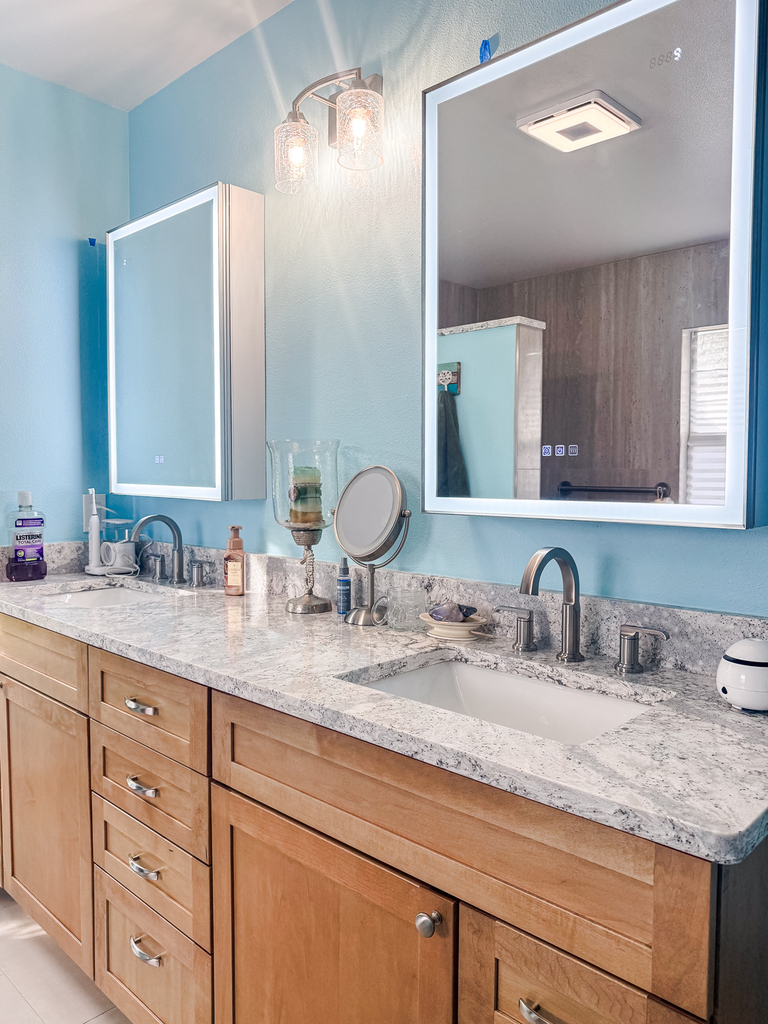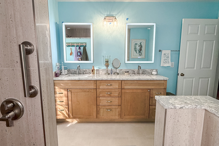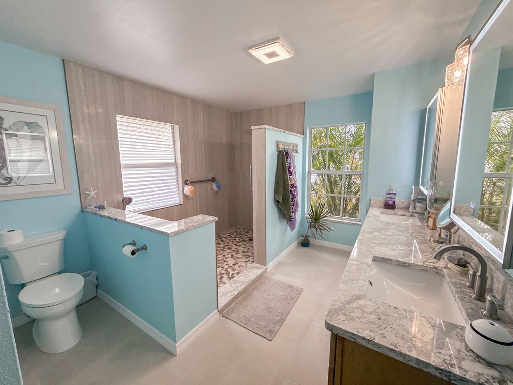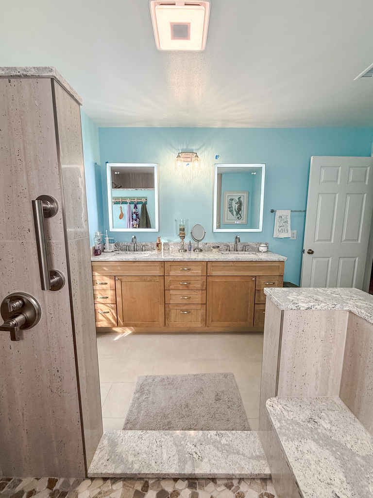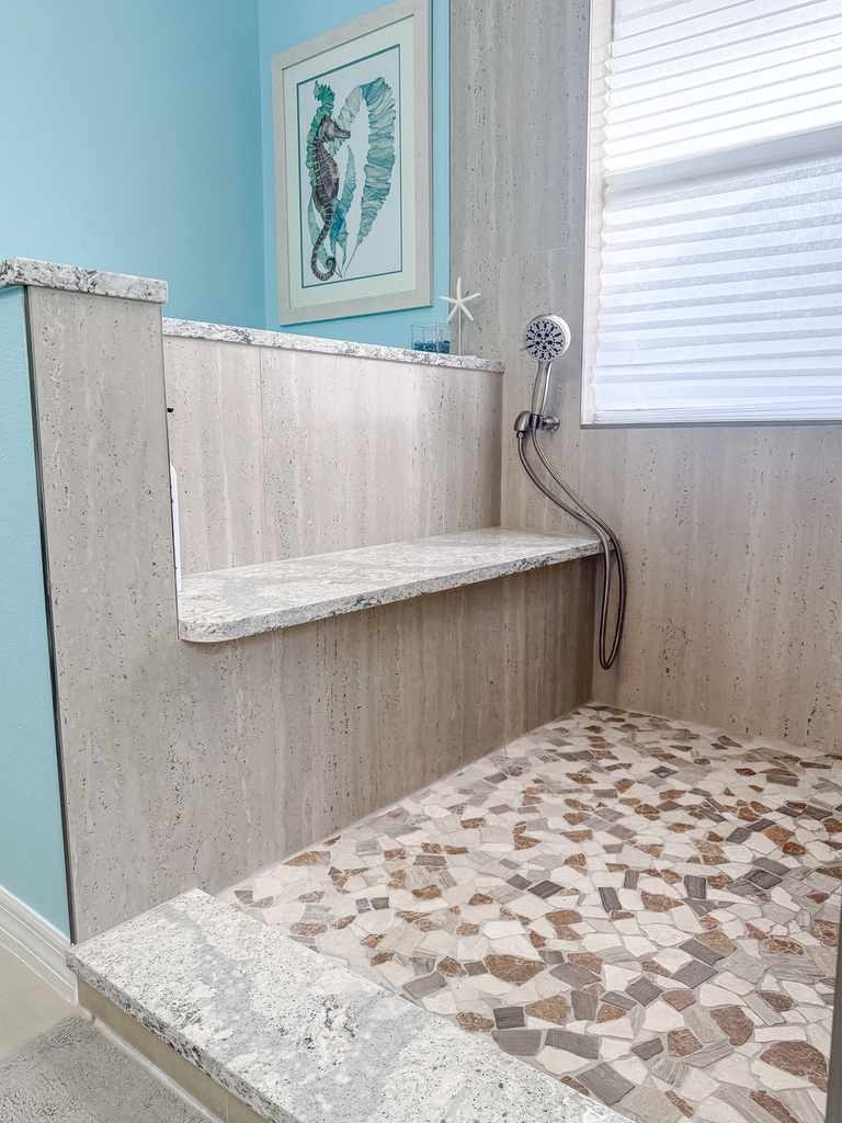 Coastal blue tones were carried throughout the bathroom to complement the sand inspired textures. Custom vanities with light stone countertops, upgraded fixtures, and modern lighting complete the remodel, resulting in a bathroom that feels larger, brighter, and perfectly suited for everyday coastal living