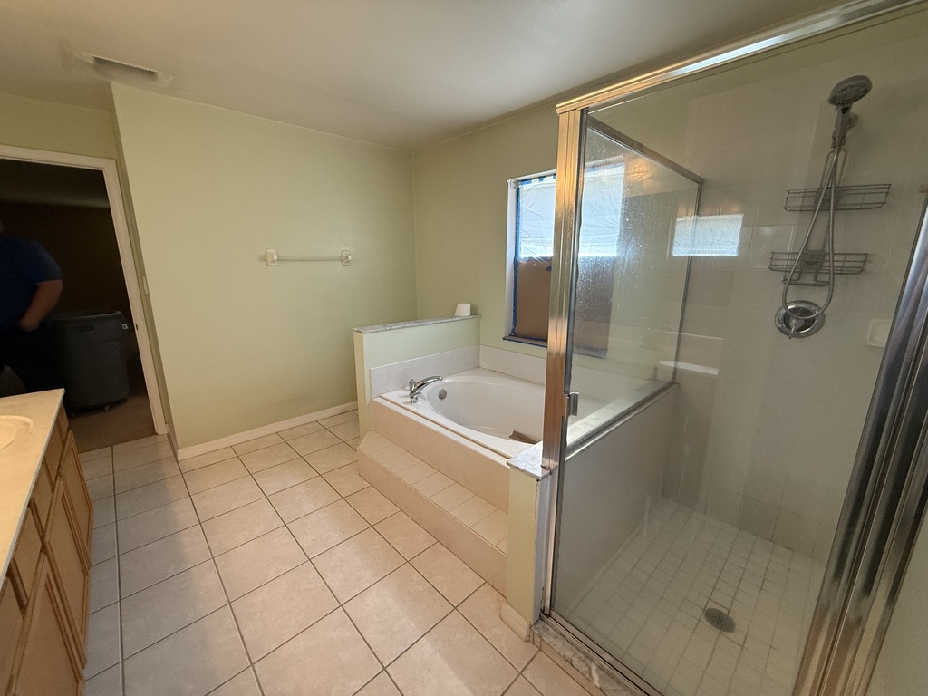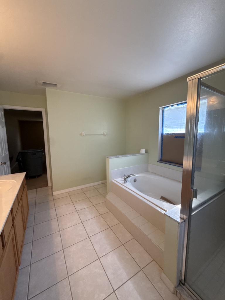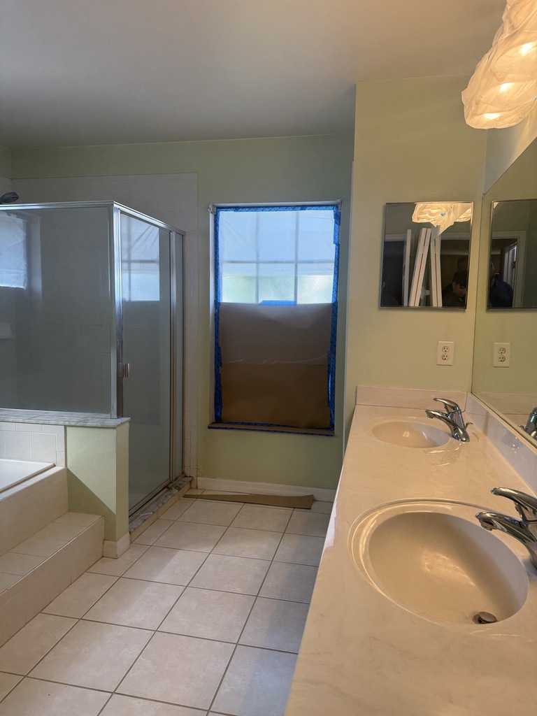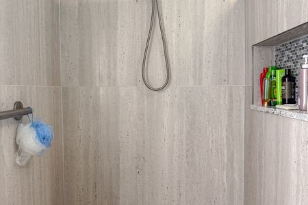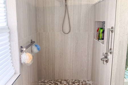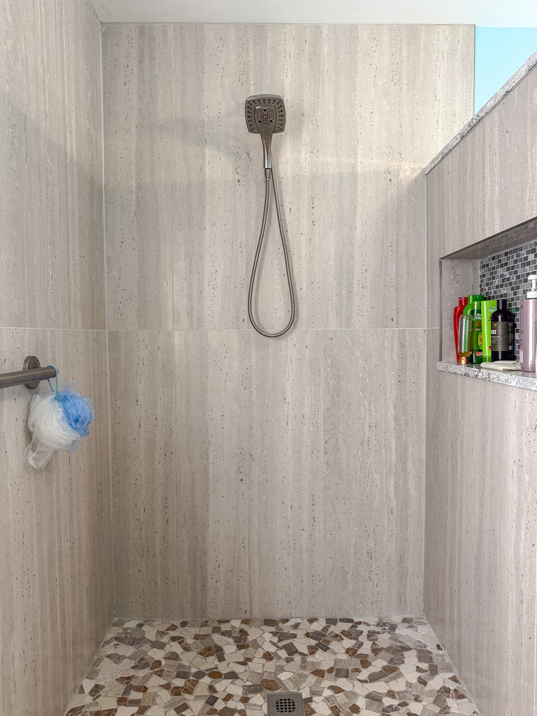 The walk in shower features sand textured tile with a subtle glossy finish that reflects light and enhances the coastal feel of the space. An open layout and expanded footprint make the shower feel bright, comfortable, and spa inspired.