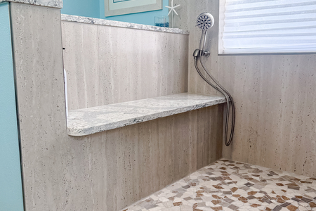This beach themed bathroom remodel completely transformed the layout by removing the existing bathtub and small shower to create a spacious walk in shower. The new design opens up the room and delivers a more functional and modern bathing experience.