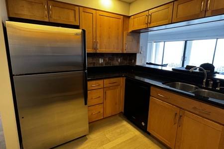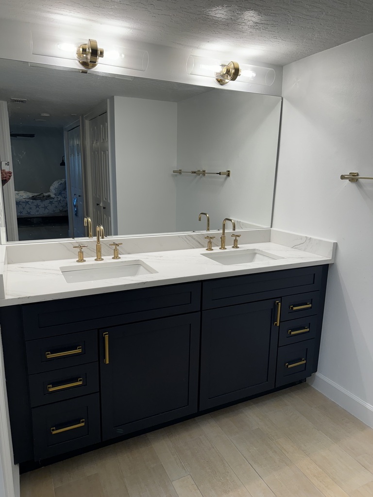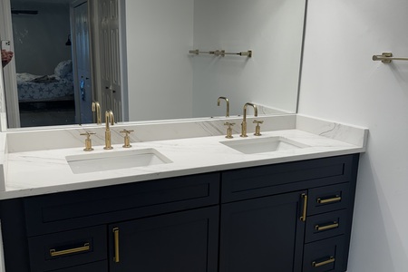 In the bathroom, we've turned outdated into extraordinary with a beautiful blue vanity and French gold fixtures, paired with a rain head shower and sleek large format tiles. Let us bring the coastal vibe to your home, enhancing both beauty and functionality.