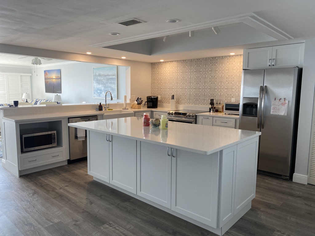 Remodeling outdated vacation condo’s are one of our favorite jobs to complete. Replacing the old carpet with beautiful vinyl flooring throughout the home, removing the kitchen wall to open the entire space, and new cabinetry and countertops gave this vacation spot the modern update it needed. Completed just in time for the family to make the long trip down from NY, to enjoy Florida’s beautiful “winters”!